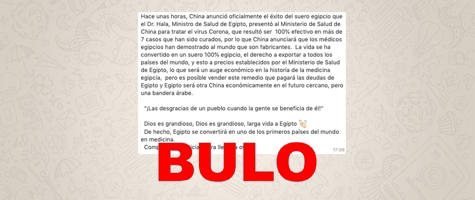 Egipto ha descubierto la cura del coronavirus. Esta frase está circulando por WhatsApp en una cadena que asegura que China ha anunciado la eficacia de un supuesto "suero egipcio" presentado por el Dr. Hala que serviría para curar el coronavirus, y que habría sido descubierto por científicos egipcios. Se trata de un bulo.