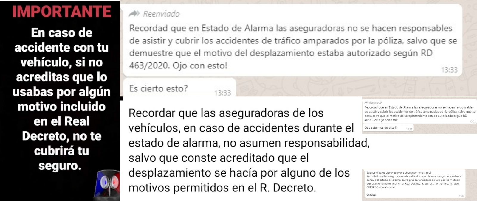 Se está viralizando que "en Estado de Alarma las aseguradoras no se hacen responsables de asistir y cubrir los accidentes de tráfico amparados por la póliza, salvo que se demuestre que el motivo del desplazamiento estaba autorizado según RD 463/2020". La Unión Española de Entidades Aseguradoras y Reaseguradoras afirma que el seguro también protege en estado de alarma.