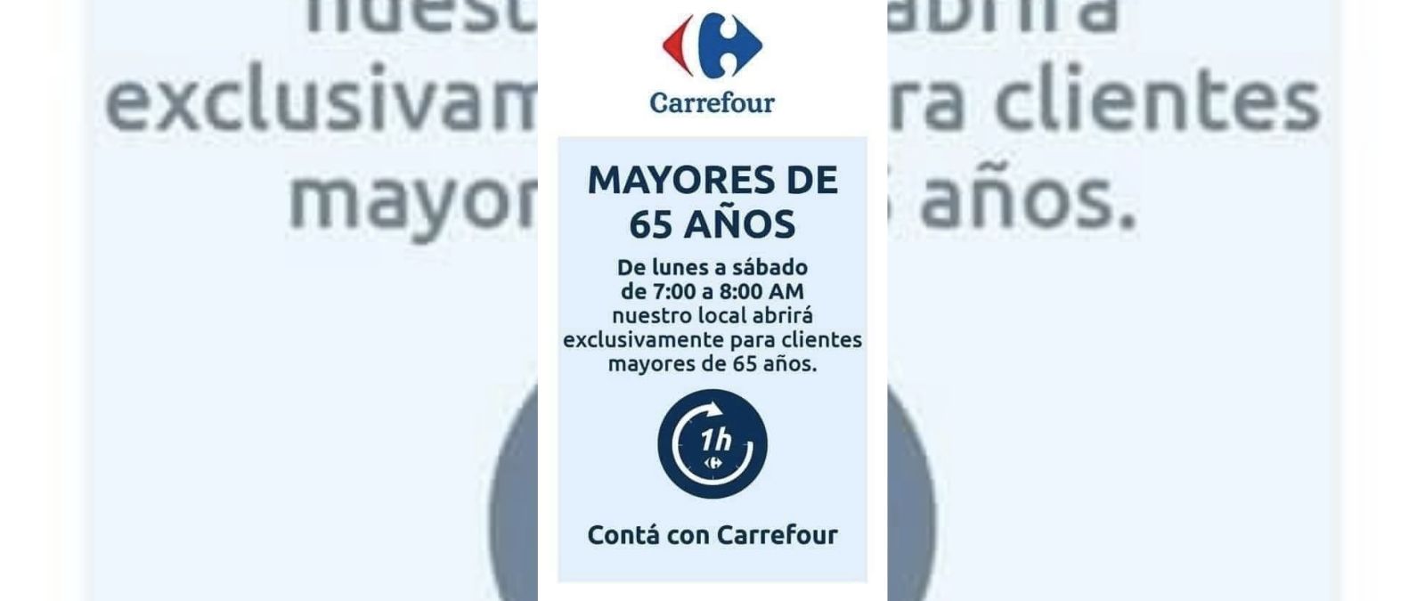 Está circulando por redes sociales una imagen que asegura que Carrefour va a abrir las puertas de sus establecimientos “de 7:00 a 8:00 am” para “clientes mayores de 65 años” en España. Esta imagen se está difundiendo como si fuera una medida tomada en España. Es un bulo aquí en España a día 17 de marzo: Carrefour España nos asegura que todos sus establecimientos en el país se abren a las 9 de la mañana y se cierran a las 9 de la noche.