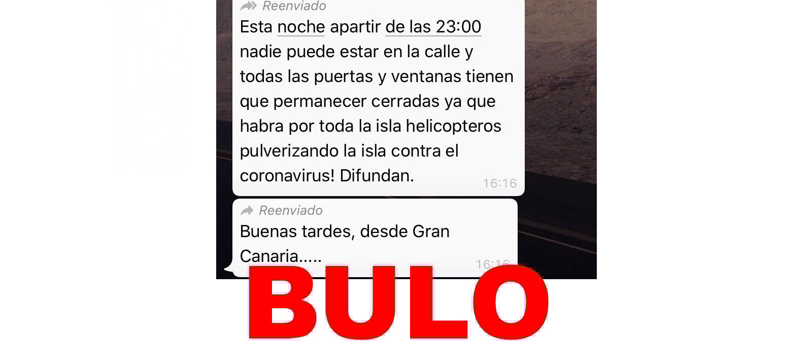 Nos habéis mandado una cadena de WhatsApp que aconseja cerrar puertas y ventanas porque "esta noche a partir de las 23:00 (...) habrá por toda la isla helicópteros pulverizando la isla contra el coronavirus". Circula tanto por Tenerife como por Gran Canaria. Pero es un bulo que ya se ha movido con otras versiones. La Delegación del Gobierno en Canarias lo desmiente desde su perfil de Twitter y el Ministerio de Defensa también nos lo desmintió con bulos anteriores. Tampoco hay ninguna comunicación ni alerta oficial por parte de las autoridades.*