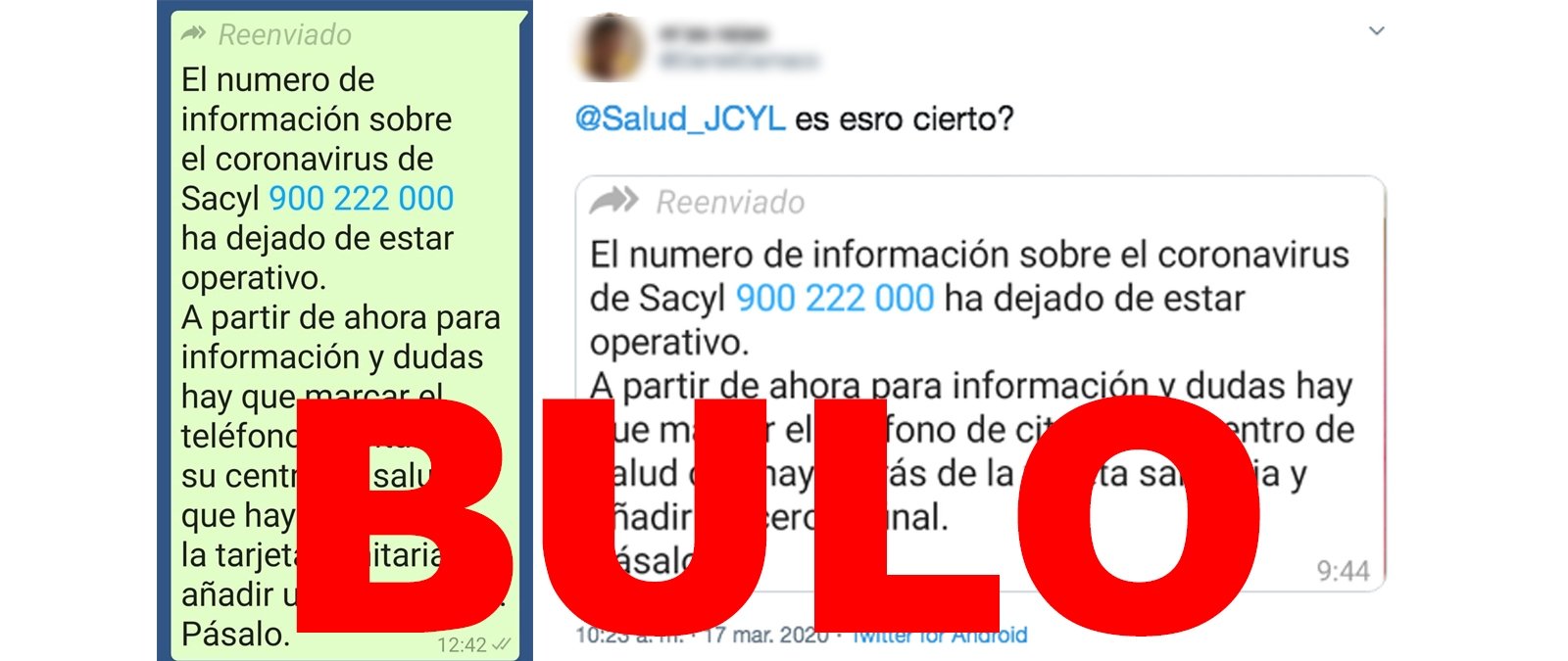 Una cadena de WhatsApp avisa de que "el número de información sobre el coronavirus de Sacyl [Consejería de Sanidad de Castilla y León] 900 220 000 ha dejado de estar operativo" y asegura que "a partir de ahora para información y dudas hay que marcar el teléfono de citas de su centro de salud que hay detrás de la tarjeta sanitaria y añadir un cero al final". Es un bulo que ha desmentido la propia Consejería desde su perfil de Twitter.