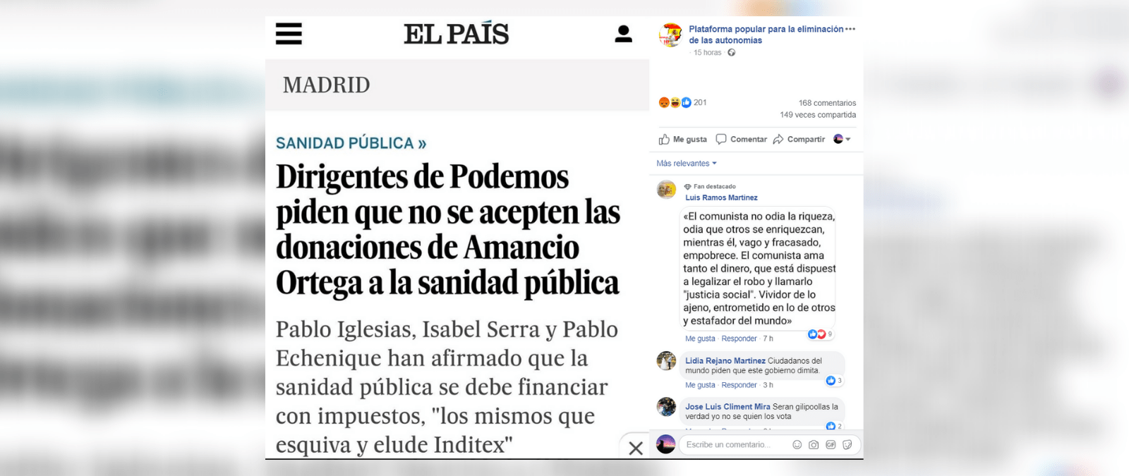 Nos habéis preguntado a través de nuestro servicio de WhatsApp por una imagen de una noticia de El País que circula por redes sociales en la que se dice que “dirigentes de Podemos piden que no se acepten las donaciones de Amancio Ortega a la sanidad pública”. Además, los usuarios que han comentado esta publicación relacionan estas declaraciones con el anuncio de Inditex de donar 300.000 mascarillas para luchar contra el coronavirus. Cuidado, la noticia no es actual y está descontextualizada.