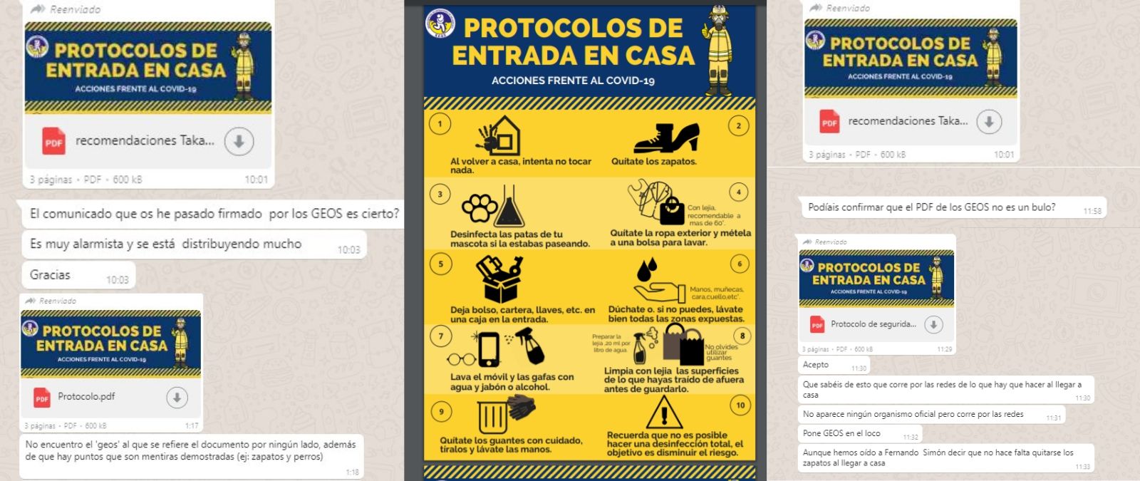 En el documento informan sobre medidas a tomar al llegar a casa, si convives con una persona en riesgo y las medidas al salir de casa. Desde Maldita.es ya os hemos contado las medidas estándar que recomienda la OMS a tomar y qué sabemos sobre dejar o no los zapatos fuera de casa y las mascotas.