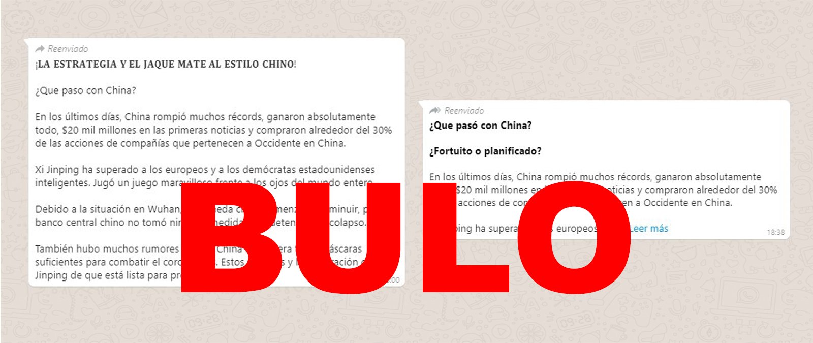 Nos habéis preguntado muchísimo por una cadena en la que se explica la supuesta estrategia que ha seguido China para ganar 20 mil millones durante la epidemia de coronavirus. Según se puede leer en el texto, China aprovechó la devaluación de las acciones "de europeos y estadounidenses" en el mercado de valores chino para comprarlas. Cuidado porque es un bulo, es un texto de 2014 que originalmente se refería a Rusia. En este, en lugar de señalar a China, la crisis del coronavirus y a Xi Jinping, líder del Partido Comunista chino, se nombraba a Rusia, la anexión de Crimea y a Vladimir Putin como protagonistas de este "jaque mate". Os lo explicamos.