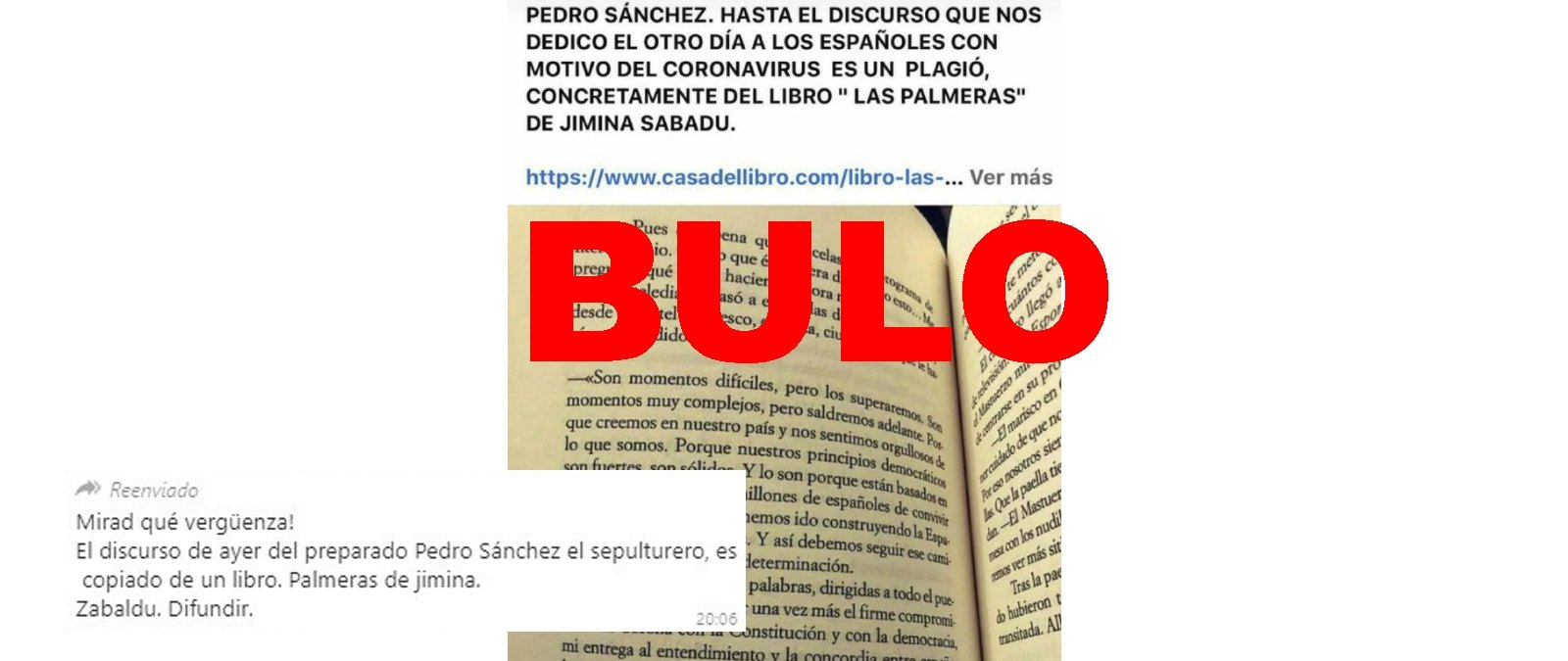 Está circulando una imagen que asegura que el presidente del Gobierno, Pedro Sánchez, plagió del libro Las Palmeras el discurso que dio el pasado 13 de marzo para anunciar que se iba a declarar el estado de alarma por el coronavirus. Sin embargo, el discurso que aparece en esa novela es el que dio el rey Felipe VI el 3 de octubre de 2017 tras el referéndum del 1-O en Cataluña. Las Palmeras se escribió después de dicho discurso.