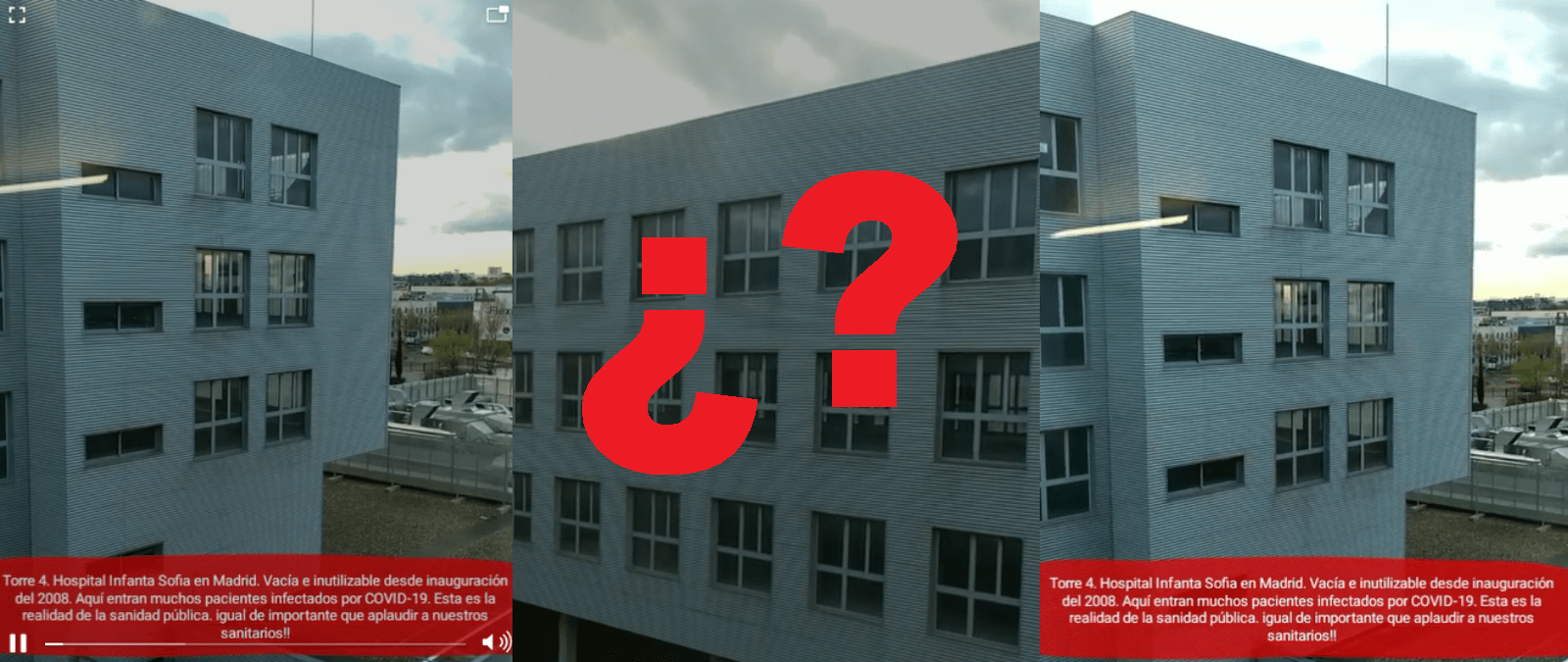 Está circulando un video en que una persona habla de que la torre 4 del Hospital Infanta Sofía, ubicado en la localidad de San Sebastián de los Reyes (Madrid), está inutilizable “desde el día uno que abrió el hospital” mientras que se están habilitando hospitales militares y hoteles para atender a los afectados por el COVID-19. Os explicamos lo que sabemos.