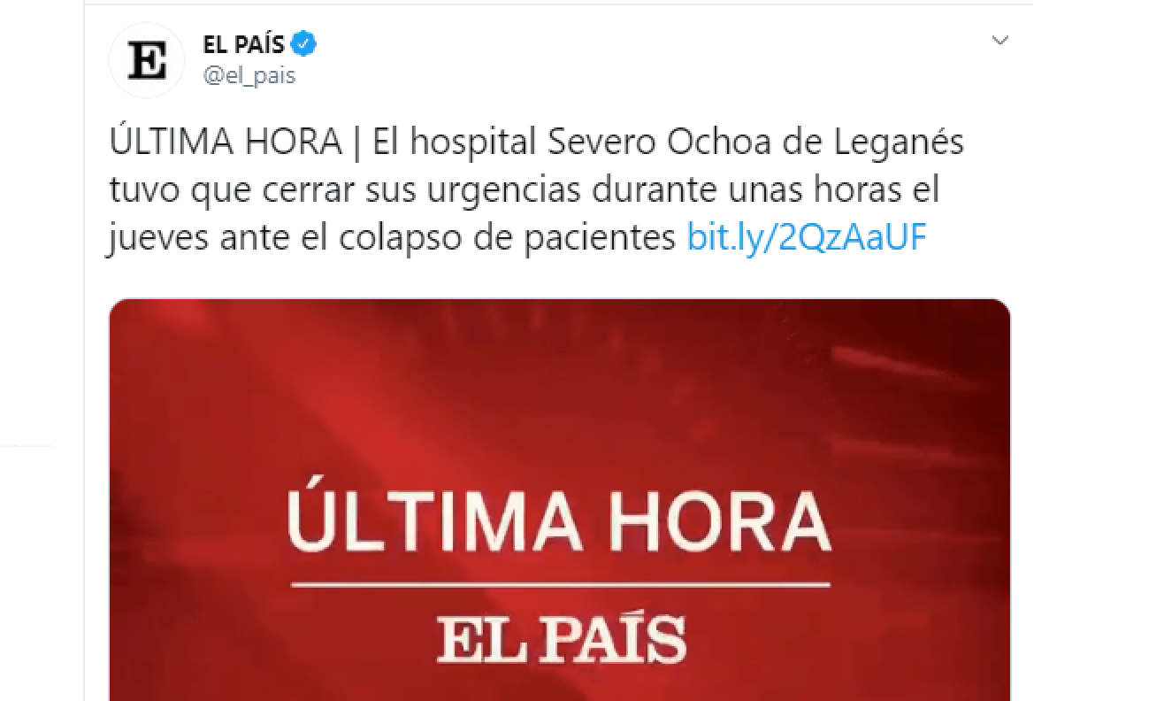 El tuit de El País que afirma que las urgencias fueron cerradas enlaza una noticia cuyo titular es “El Severo Ochoa de Leganés deriva ambulancias a otros hospitales ante el colapso de las urgencias”. En el propio artículo se dice que “Jesús García, del sindicato de enfermería Satse, aclara que ‘en ningún momento se cerraron las urgencias’, como se ha afirmado en redes sociales y medios de comunicación: ‘No reciben ambulancias y están siendo derivadas a otros centros, pero no se puede cerrar la puerta a los ciudadanos que llegan ni a los que deriva atención primaria’”.