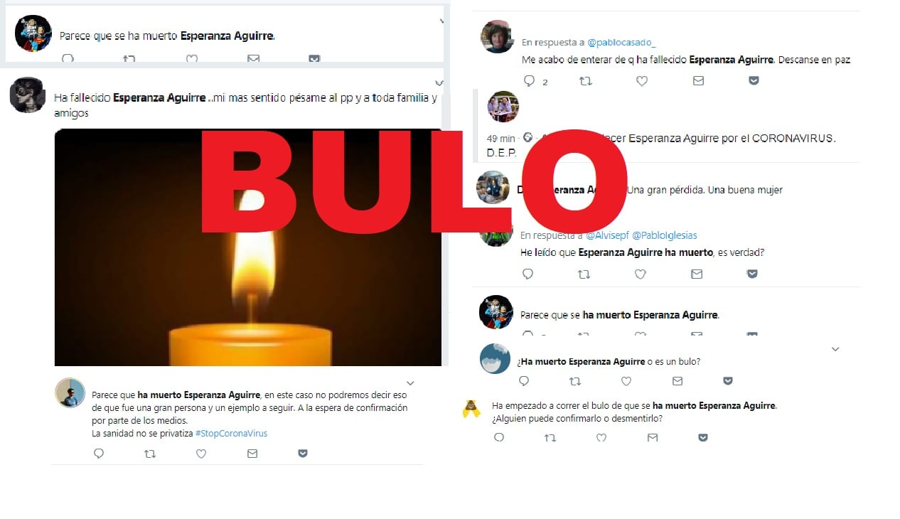 Esperanza Aguirre y su marido fueron hospitalizados por coronavirus COVID-19 el pasado 19 de marzo tras dar positivo en la prueba. En la tarde del 22 de marzo varios tuits afirmaban que la ex presidenta de la Comunidad de Madrid había muerto. Desde la dirección de comunicación del Partido Popular desmienten esta desinformación y nos remiten además a un tuit del periodista de El Mundo, Juanma Lamet.