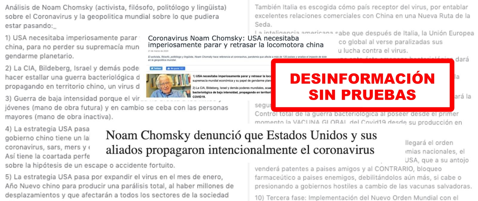 En una entrevista a Noam Chomsky publicada por el medio italiano Il Manifesto le atribuyen la cita "no hay credibilidad al afirmar que el virus se propagó deliberadamente", contraria a la cadena que ahora circula.