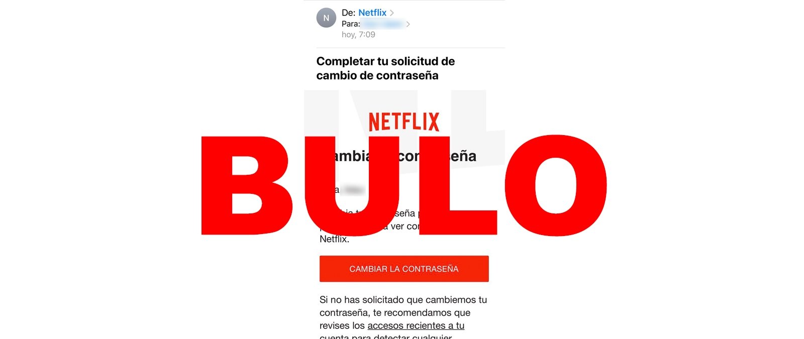 Un correo, supuestamente de Netflix, te informa de pide que cambies tu contraseña para que "puedas volver a ver los contenidos de Netflix" e incluye un enlace. Es un bulo, se trata de un intento de phishing, una técnica que se utiliza para intentar quedarse con tus datos personales.