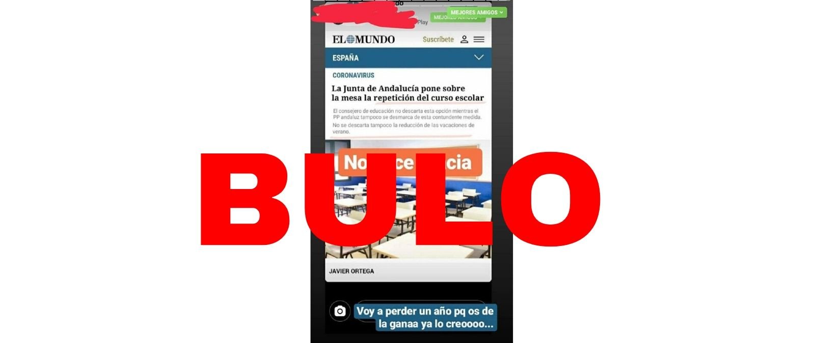 Circula en redes sociales la captura de un supuesto artículo del diario El Mundo titulada "La Junta de Andalucía pone sobre la mesa la repetición del curso escolar", que según la imagen, habría sido publicado por el periodista Javier Ortega el viernes 20 de marzo. Pero se trata de una captura falsa. No hemos encontrado ninguna prueba de que el contenido haya sido publicado, la tipografía usada es distinta y la Junta de Andalucía niega haber planteado tal acción.