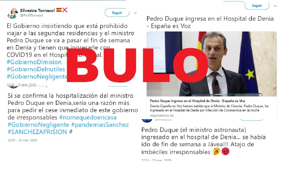 Pedro Duque, ministro de Ciencia, no está en un hospital de Denia (Alicante) ingresado por coronavirus. Se está moviendo por redes sociales que después de, supuestamente, haberse ido de fin de semana a Jávea, ha tenido que ser hospitalizado por COVID-19. Es un bulo.