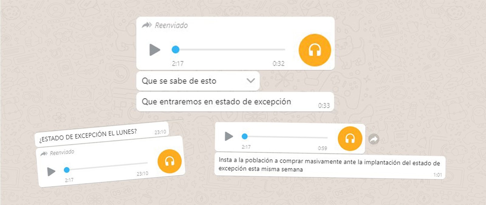 Además, en el audio viral se dice que el estado de excepción va a durar 40 o 50 días. Pero, según el artículo 13 de esta Ley Orgánica, la duración del estado de excepción no puede exceder los treinta días (que podría prorrogarse si lo autoriza el Congreso).