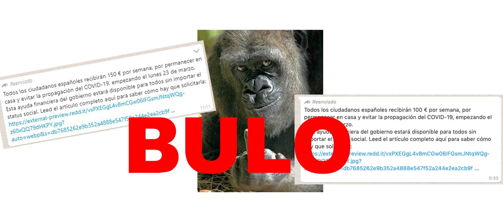 Tampoco una ayuda de 100€ o 150€ de parte del Gobierno. Cuando se pincha en el enlace que aparece en el mensaje, lleva a una foto de un gorila sacando un dedo. Por lo tanto, se trata de una broma que se ha viralizado en algunos casos como real por no pinchar el enlace.