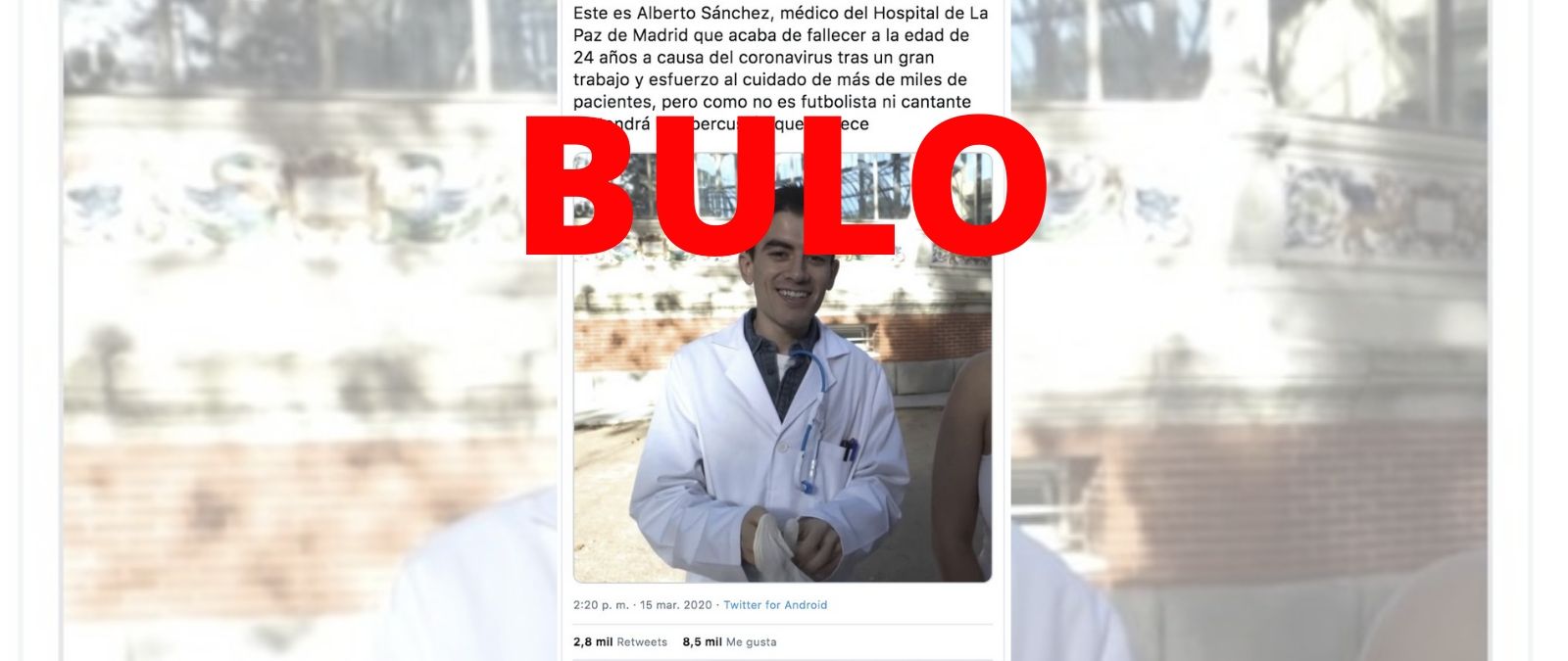 Está circulando un mensaje que afirma que "este es Alberto Sánchez, médico del Hospital de La Paz de Madrid que acaba de fallecer a la edad de 24 años a causa del coronavirus" y que va acompañado de una foto. Es un bulo: ni es Alberto Sánchez ni es un médico del Hospital de La Paz, es el actor porno Jordi 'el niño polla'.