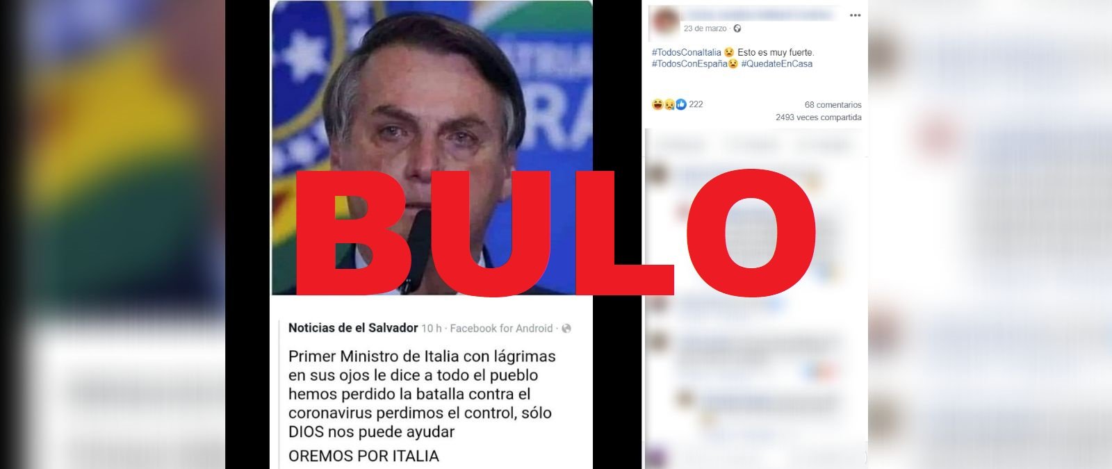 Se ha viralizado por las redes sociales una imagen que afirma que "el primer ministro de Italia con lágrimas en sus ojos le dice a todo el pueblo" que su país ha perdido "la batalla contra el coronavirus" y añade que "sólo Dios nos puede ayudar". Es un bulo: se trata de una imagen del presidente de Brasil, Jair Bolsonaro, y no hay pruebas de que el primer ministro de Italia, Giuseppe Conte, haya dicho que Italia "ha perdido la batalla contra el coronavirus".