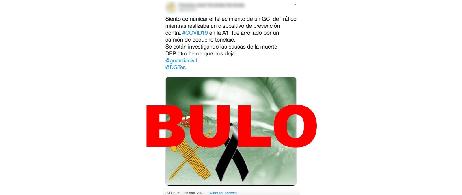 Se ha difundido que un guardia civil ha fallecido atropellado en la A-1, en Madrid, mientras realizaba un control de las medidas del estado de alarma por el COVID-19. Es un bulo. Esta mañana, en la autovía A-42 un vehículo con cuatro pasajeros ha atropellado a un agente de tráfico de la Guardia Civil, pero no ha muerto.