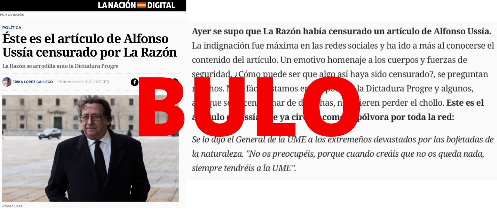 Alfonso Ussia aseguró el 24 de marzo en su cuenta de Twitter que "mañana, por primera vez en 15 años, no saldrá por censura interior mi artículo en La Razón", un día después de que se publicara el artículo sobre la UME. Por lo tanto, no hacía referencia al artículo que señala La Nación Digital como censurado.
