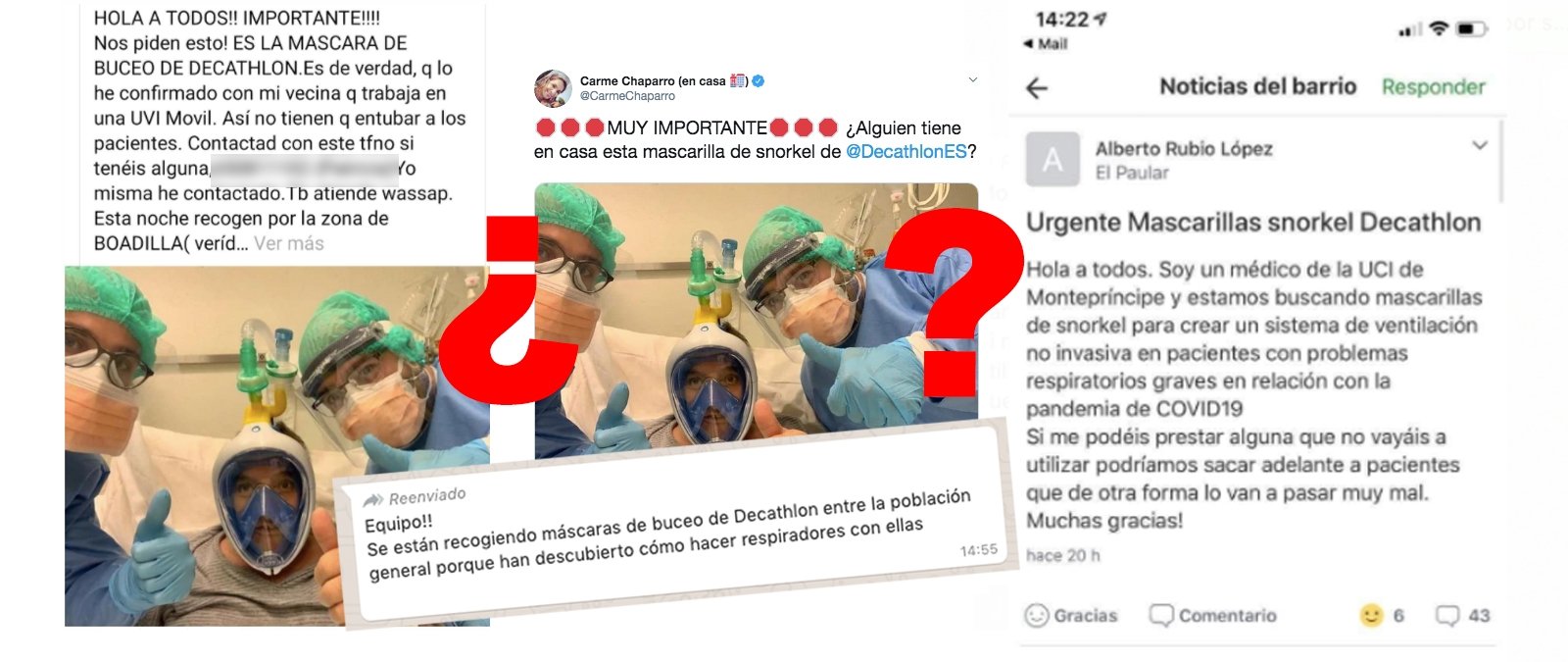 Se ha viralizado la petición del doctor Alberto Rubio López, médico de la UCI del Hospital Montepríncipe, en la que afirma que están buscando máscaras de esnórquel para crear un sistema de ventilación para pacientes con problemas respiratorios "en relación con la pandemia del COVID19".