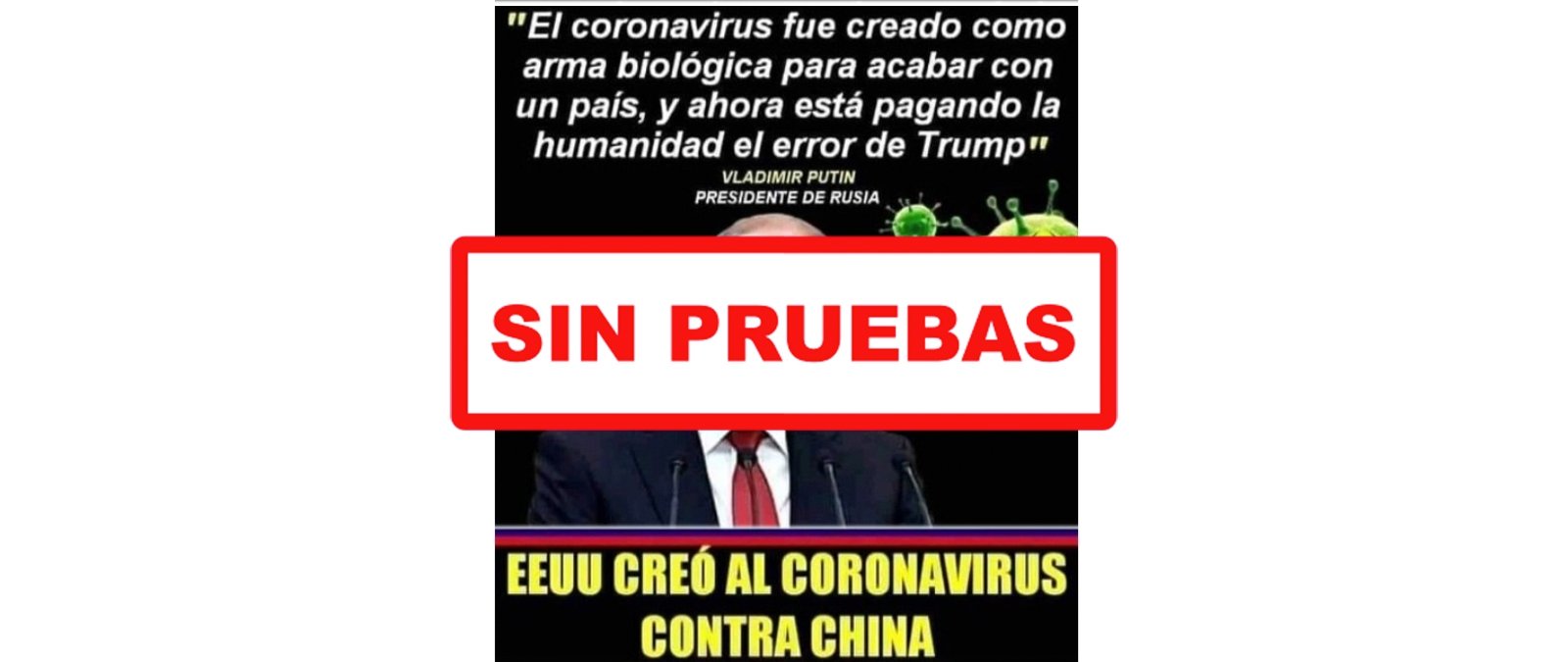 El contenido que se está compartiendo en redes sociales es una foto del dirigente ruso acompañada de un texto que dice que "el coronavirus fue creado como arma biológica para acabar con un país, y ahora está pagando la humanidad el error de Trump". Pero en la imagen no aparece una dirección web en la que se pueda leer o escuchar que Putin ha hecho esas supuestas declaraciones.