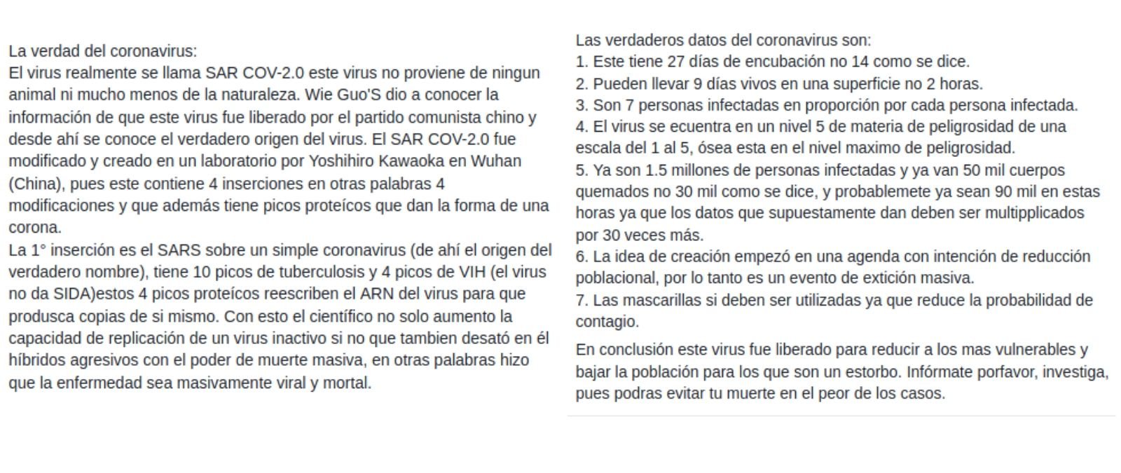 Ya os contamos que no hay evidencia científica sobre el origen del coronavirus en un laboratorio y su supuesto uso como arma biológica. "Los que se han sacado este teoría conspiranoica tienen muy poca idea de cómo es la biología del virus y/o cómo se hace ingeniería genética de coronavirus", afirma a Maldita.es la viróloga Sonia Zuñiga, investigadora de coronavirus en el Centro Nacional de Biotecnología.