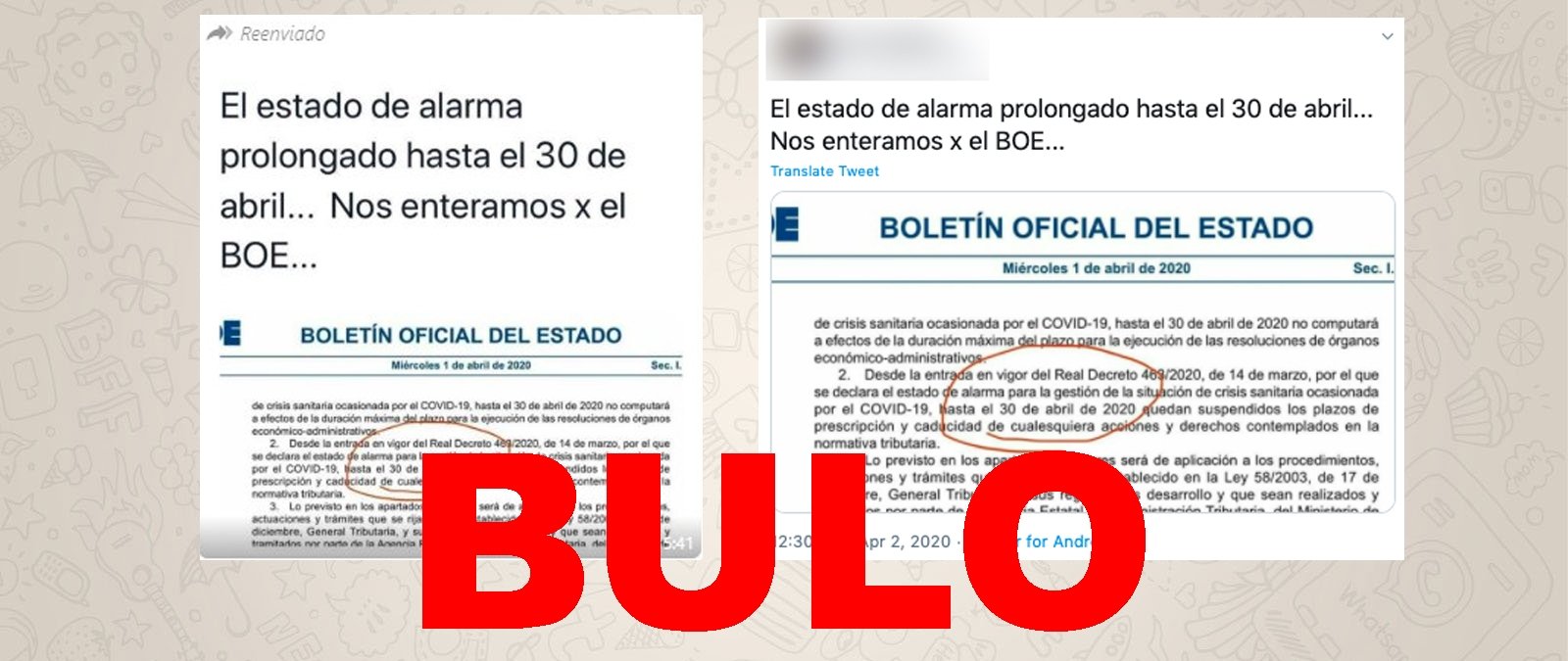 Circula por redes sociales una captura del Boletín Oficial del Estado (BOE) junto al mensaje de "el estado de alarma prolongado hasta el 30 de abril... Nos enteramos por el BOE". El documento que circula es del BOE publicado el 1 de abril de 2020 que hace referencia a la suspensión de los plazos de algunos procedimientos tributarios hasta el 30 de abril. En ningún caso ese documento menciona que el estado de alarma se vaya a prolongar hasta ese día.