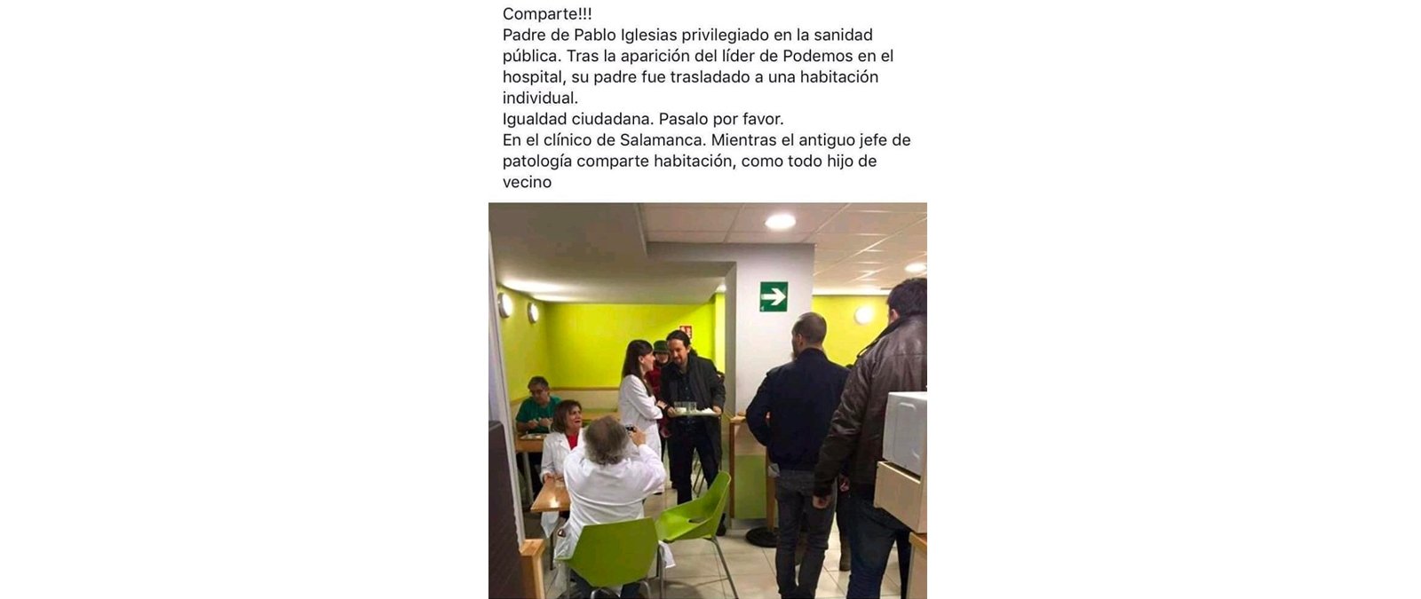 La imagen que se difunde ahora no es actual. Fue publicada por medios regionales como El Norte de Castilla o La Opinión de Zamora en febrero de 2016, cuando se dio la noticia de que Pablo Iglesias había visitado a su padre, Javier Iglesias, ingresado en el Hospital Clínico de Salamanca tras un transpante de riñón, según informó EFE.
