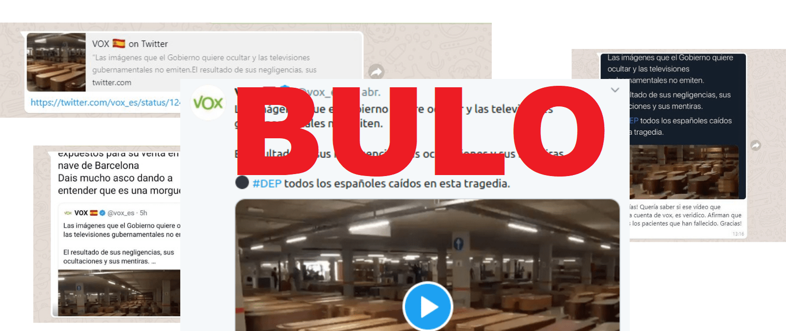 En un tuit difundido desde la cuenta oficial del partido Vox, se muestra un vídeo de un parking lleno de féretros acompañado de un texto que dice que son “las imágenes que el Gobierno quiere ocultar y las televisiones gubernamentales no emiten”. Se trata de un bulo, ya que estas imágenes del parking del tanatorio de Collserola (Barcelona) sí fueron emitidas en el telediario de TVE el día 2 de abril a las 15 horas, unas tres horas antes de la publicación del tuit de Vox.