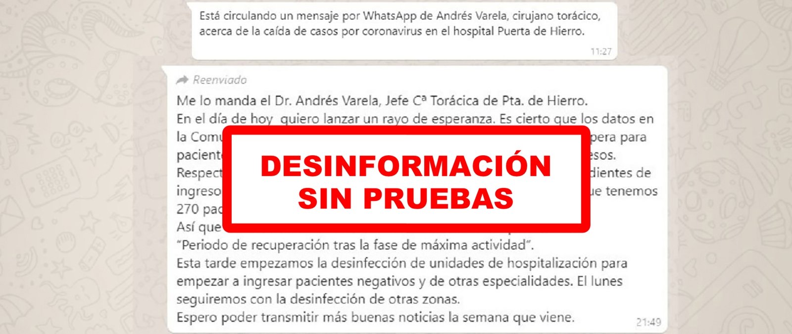 La cadena que circula no aporta ninguna prueba de que lo haya dicho. Además, hemos contactado con Andrés Varela y nos indica que el contenido que circula no es suyo y que "está llegando como mío que yo no he enviado". Y desde el Hospital Puerta de Hierro nos indican que se trata de un contenido falso y que "no es real" que "haya habido 30 camas libres" o que "se haya empezado la desinfección de unidades de hospitalización".