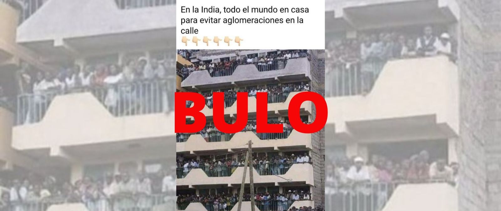 Nos habéis preguntado por una imagen que está circulando por redes sociales afirmando que es India durante el confinamiento. En la imagen se ve la fachada de un edificio con las terrazas abarrotadas de gente y se difunde con el mensaje "en la India todo el mundo en casa para evitar aglomeraciones en la calle". Es un bulo: la foto no tiene nada que ver con el coronavirus ni con India, fue tomada en 2011 en Kenia.