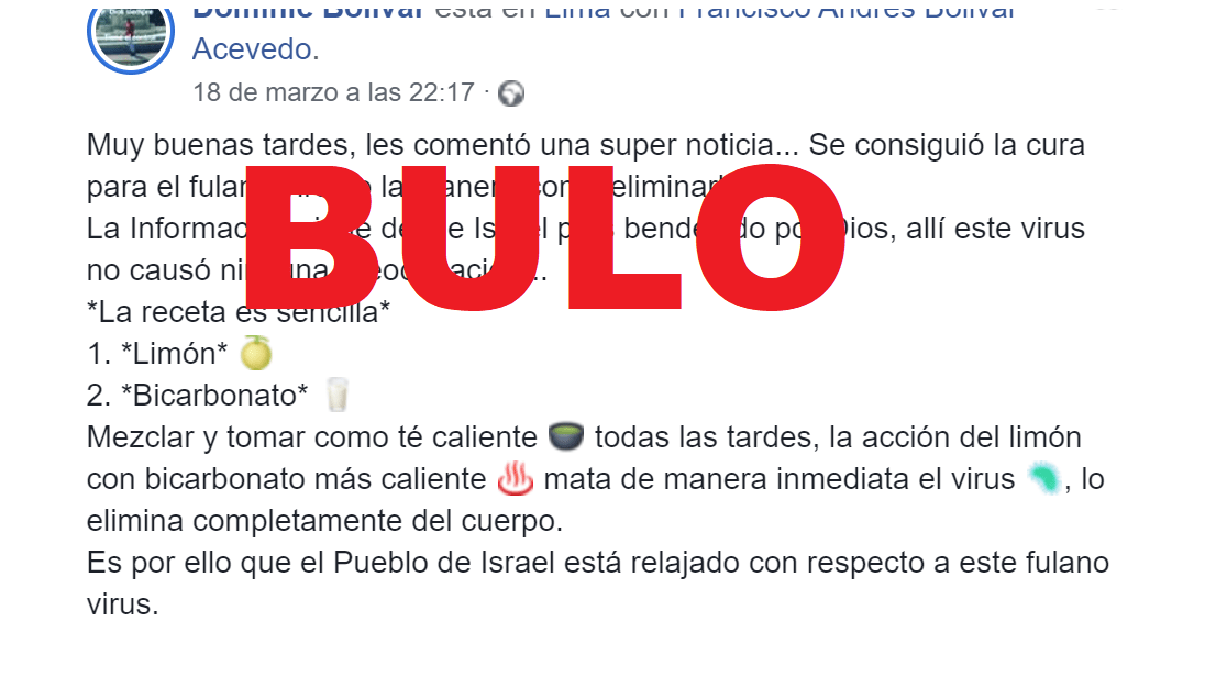 Se mueve una cadena de WhatsApp que afirma que existe una “receta” de un té caliente que elimina el coronavirus. Limón y Bicarbonato en forma de té caliente. Es un bulo. Ningún alimento previene ni cura ni elimina de la infección por coronavirus.