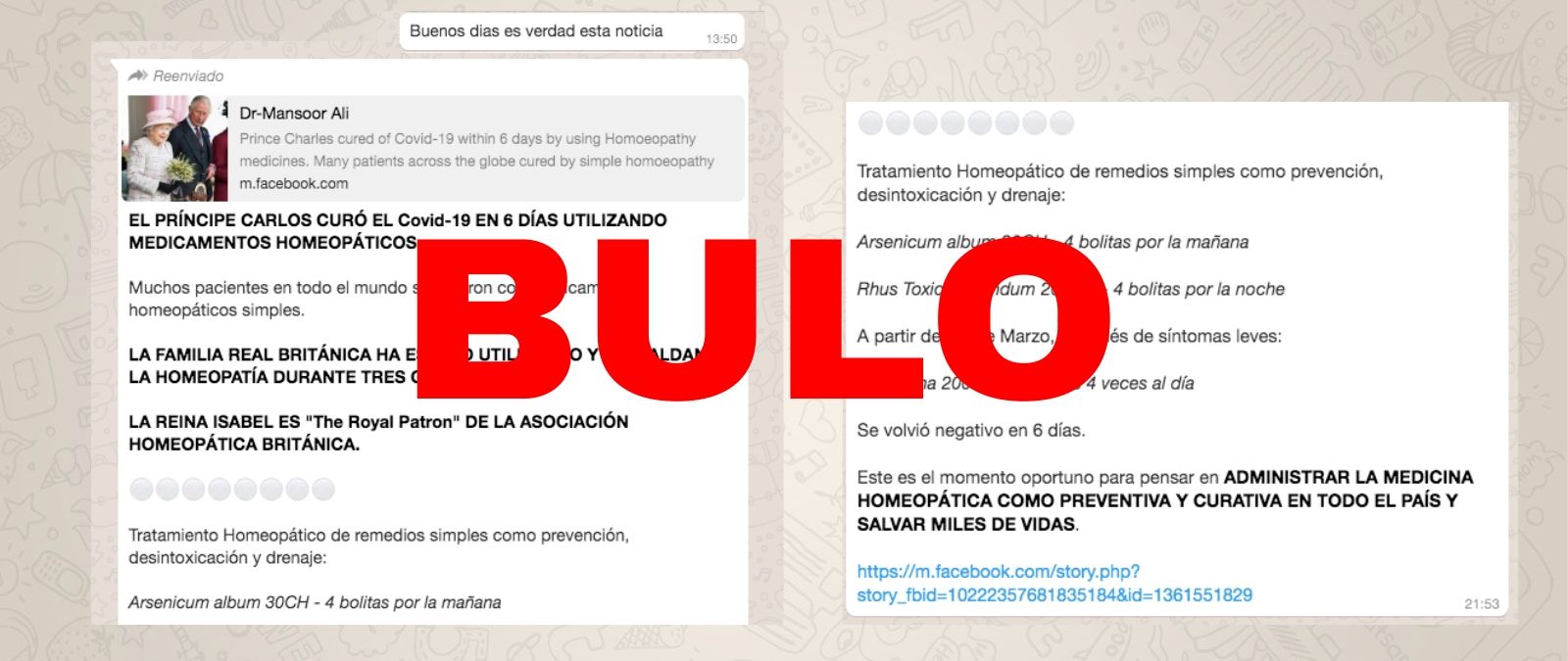 El contenido que se está difundiendo tanto por WhatsApp como por otras redes sociales dice que el príncipe Carlos se ha curado de la Covid-19 con homeopatía y añade que "muchos pacientes en todo el mundo se curaron usando medicamentos homeopáticos simples".