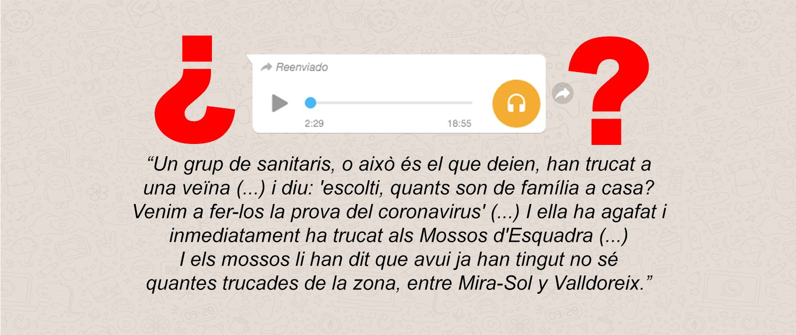 Nos habéis mandado a nuestro servicio de WhatsApp un audio en catalán en el que una señora avisa de que hay un grupo de falsos sanitarios que entra en las casas a robar utilizando la excusa de que van a hacer "pruebas del coronavirus". Dice que los Mossos d'Esquadra han recibido denuncias de estos sucesos en la zona de San Cugat del Vallés (Barcelona, Cataluña), concretamente en el distrito de Mira-Sol y Valldoreix, entidad municipal descentralizada de San Cugat del Vallés. Os explicamos lo que sabemos al respecto.