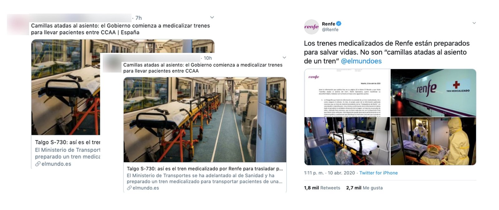 Este 10 de abril el periódico El Mundo ha publicado un artículo en su versión impresa titulado: "Camillas atadas al asiento de un tren". Dicho artículo incluye la foto del interior de uno de los trenes que, según ellos, habría sido medicalizado para transportar a pacientes de una comunidad autónoma a otra.