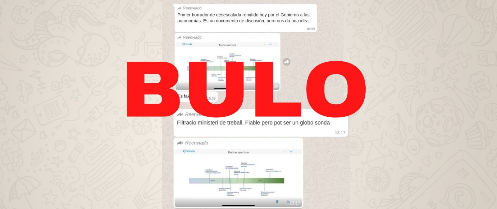 Está circulando mucho una imagen por redes de un gráfico con fechas en las que se reanudará la actividad de diferentes sectores a partir de mayo. Entre los sectores de actividad que se incluyen está la fecha de apertura de pequeños comercios, parques y jardines u hoteles. Esta imagen está circulando con mensajes “primer borrador de desescalada remitido hoy por el Gobierno a las autonomías”. Es un bulo. Este gráfico es el resultado de una encuesta realizada a 400 personas por una empresa que hace estudios de mercado del sector de la automoción sobre cuándo creen que se reactivará la actividad en los diferentes sectores.