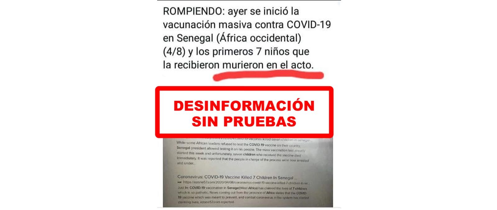 Circula mucho por WhatsApp una imagen en la que se asegura que "ayer se inició la vacunación masiva contra COVID-19 en Senegal y los primeros 7 niños que la recibieron murieron en el acto". Sin embargo, a fecha de 11 de abril de 2020 no existe una vacuna contra la enfermedad y no hay pruebas de que siete niños senegaleses hayan muerto. La imagen se ha viralizado al mismo tiempo que un vídeo en el que supuestamente se mostraba la detención de quien habría aplicado la vacuna, pero las autoridades senegalesas han confirmado que lo detuvieron por un malentendido y que ni se administró ninguna vacuna ni murieron siete niños por ello.*