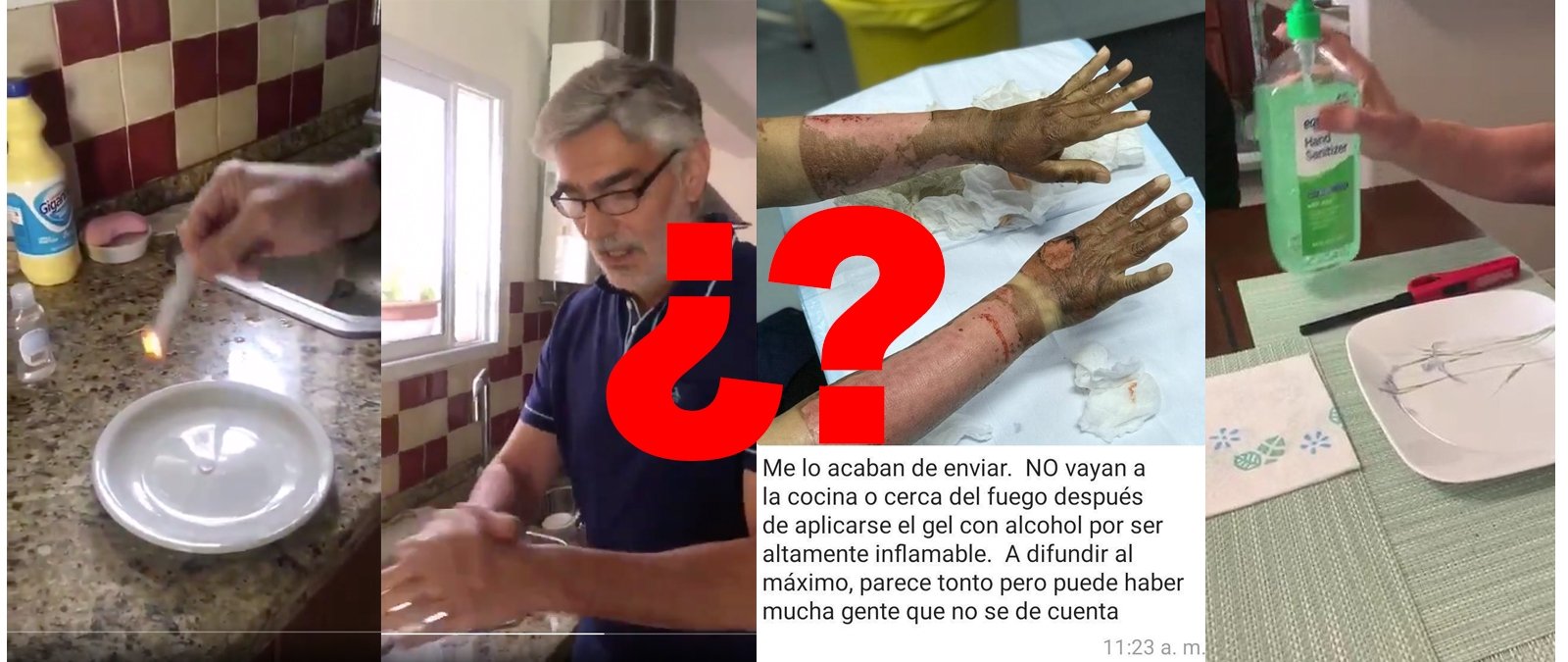 En medio de la pandemia del coronavirus, nos habéis enviado una fotografía de unos brazos supuestamente quemados en la que se avisa de lo siguiente: "no vayan a la cocina o cerca del fuego después de aplicarse gel con alcohol por ser altamente inflamable". También unos vídeos en los que se prueba que el gel es inflamable y en los que se recomienda llevar precaución si nos acercamos al fuego de la cocina tras utilizar este producto. Os explicamos lo que sabemos sobre esta advertencia viral.