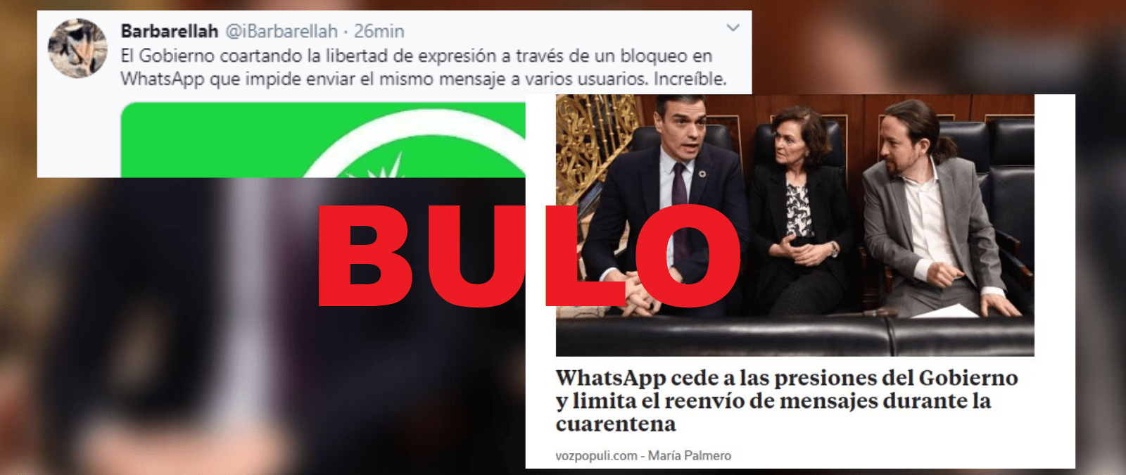 Nos estáis preguntado si el Gobierno está "coartando la libertad de expresión a través de un bloqueo en WhatsApp" que "impide enviar el mismo mensaje a varios usuarios" o si el "Gobierno ha presionado a WhatsApp para que censure contenido". Es un bulo: la limitación de reenvíos es una de las medidas que ha puesto en marcha WhatsApp a nivel mundial para limitar el reenvío de aquellos mensajes que ya han sido reenviados más de 5 veces y así "restringir la viralización" de algunos de ellos que podrían estar difundiendo desinformación, sobre todo en el contexto actual de emergencia de coronavirus. El Gobierno no tiene nada que ver, es una decisión a nivel muncial y es un proceso automático de WhatsApp.