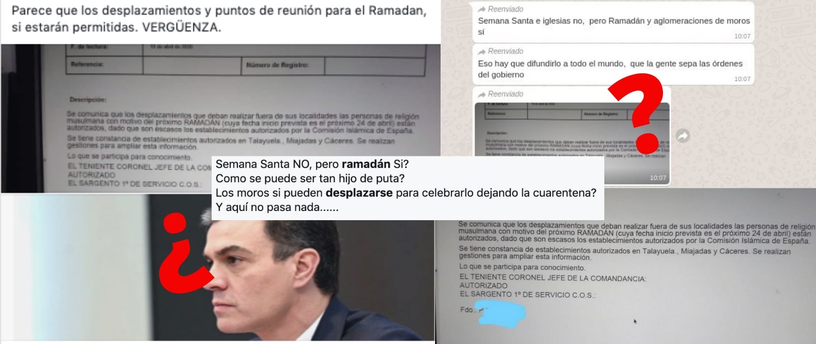 En el mensaje que se difunde se afirma que las personas musulmanas podrán desplazarse y tener puntos de reunión para Ramadán. Este mensaje circula con una imagen de un documento de la Guardia Civil que afirma que "los desplazamientos que deban realizar fuera de sus localidades las personas de religión musulmana con motivo del próximo Ramadán están autorizados, dado que son escasos los establecimientos autorizados por la Comisión Islámica en España. Se tiene constancia de establecimientos autorizados en Talayuela, Miajadas y Cáceres".