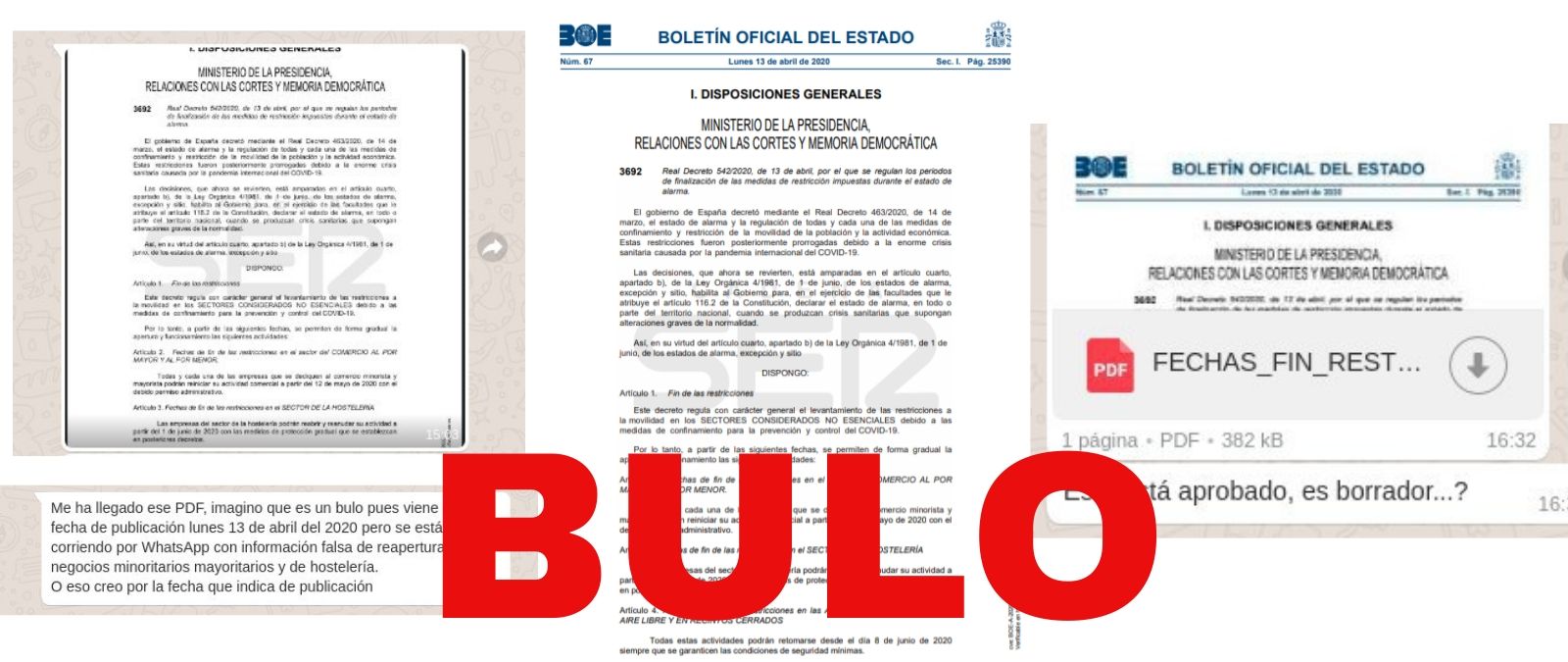 Por lo tanto, no es cierto que este supuesto Real Decreto 542/2020 publicado en el Boletín Oficial del Estado (BOE) con fecha de 13 de abril “por el que se regulan los periodos de finalización de las medidas de restricción impuestas durante el estado de alarma” sea un documento oficial.
