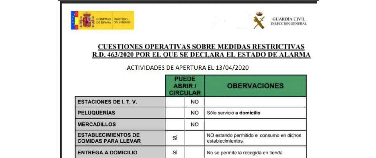 Desde su perfil oficial de Twitter, la Guardia Civil ha advertido que el documento que está circulando no es oficial y enlazan el Real Decreto que regula el estado de alarma que establece "qué actividades se pueden desarrollar y en qué condiciones".