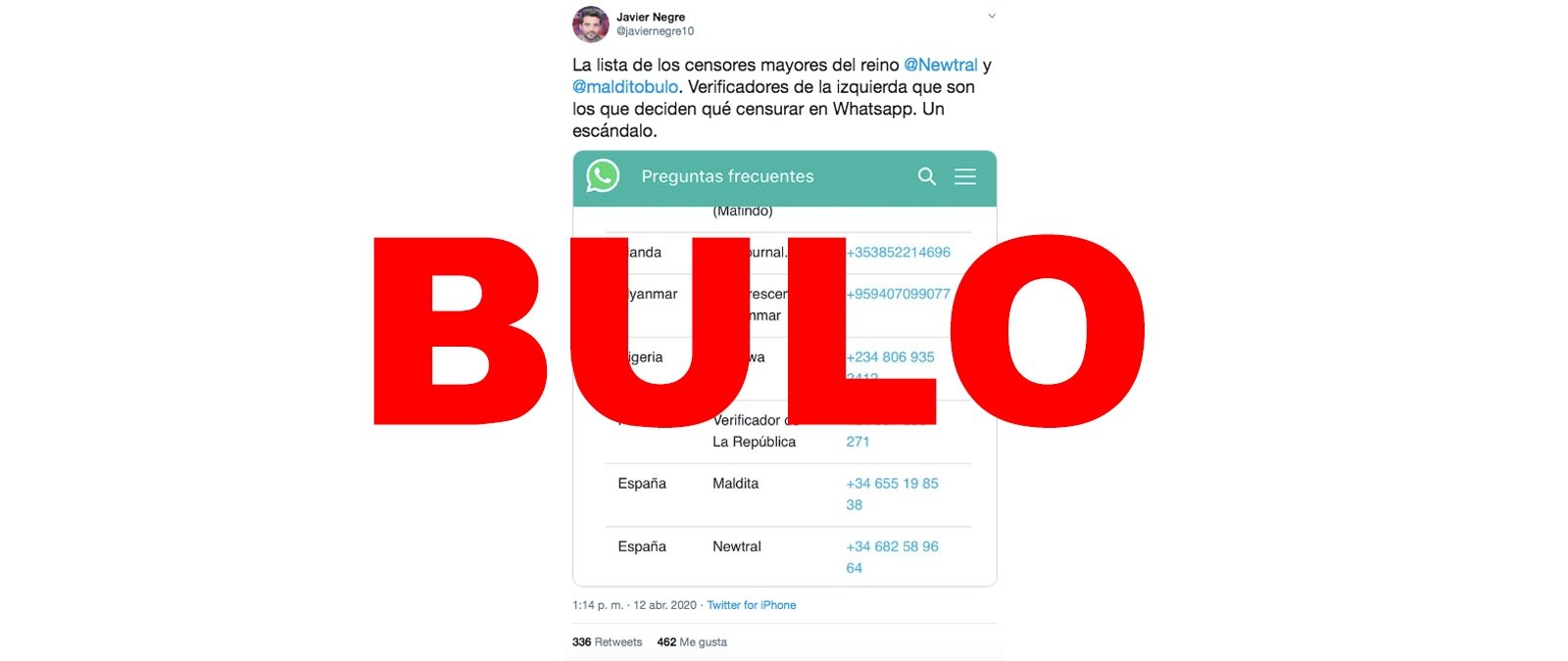 Javier Negre ha afirmado en un tuit que medios verificadores como Maldita.es y Newtral "son los que deciden qué censurar en WhatsApp" y adjunta una captura de una lista de medios especializados en fact-checking. Es un bulo. Ni Maldita.es ni el resto de medios de la lista verifican o censuran contenidos en WhatsApp. Hasta WhatsApp ha tenido que desmentirlo. Puedes leerlo aquí. Y el medio en el que trabaja, El Mundo , ha desmentido también la afirmación de Negre en este artículo.