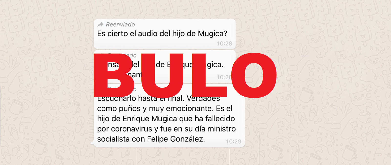 Nos habéis preguntado por un supuesto audio de Daniel Múgica, el hijo del que fuera ministro socialista con Felipe González, Enrique Múgica, fallecido el 11 de abril por coronavirus, sobre "lo que piensa del Gobierno de España". Concretamente, en el audio, el autor describe a España como "un país que tiene comprados los medios de comunicación y los manipula", añade que, "desde que ha llegado Sánchez e Iglesias, la democracia se desmorona" y concluye con un recuerdo a su padre fallecido, "tus hijos, Miguel y yo, te llevaremos siempre en el corazón".