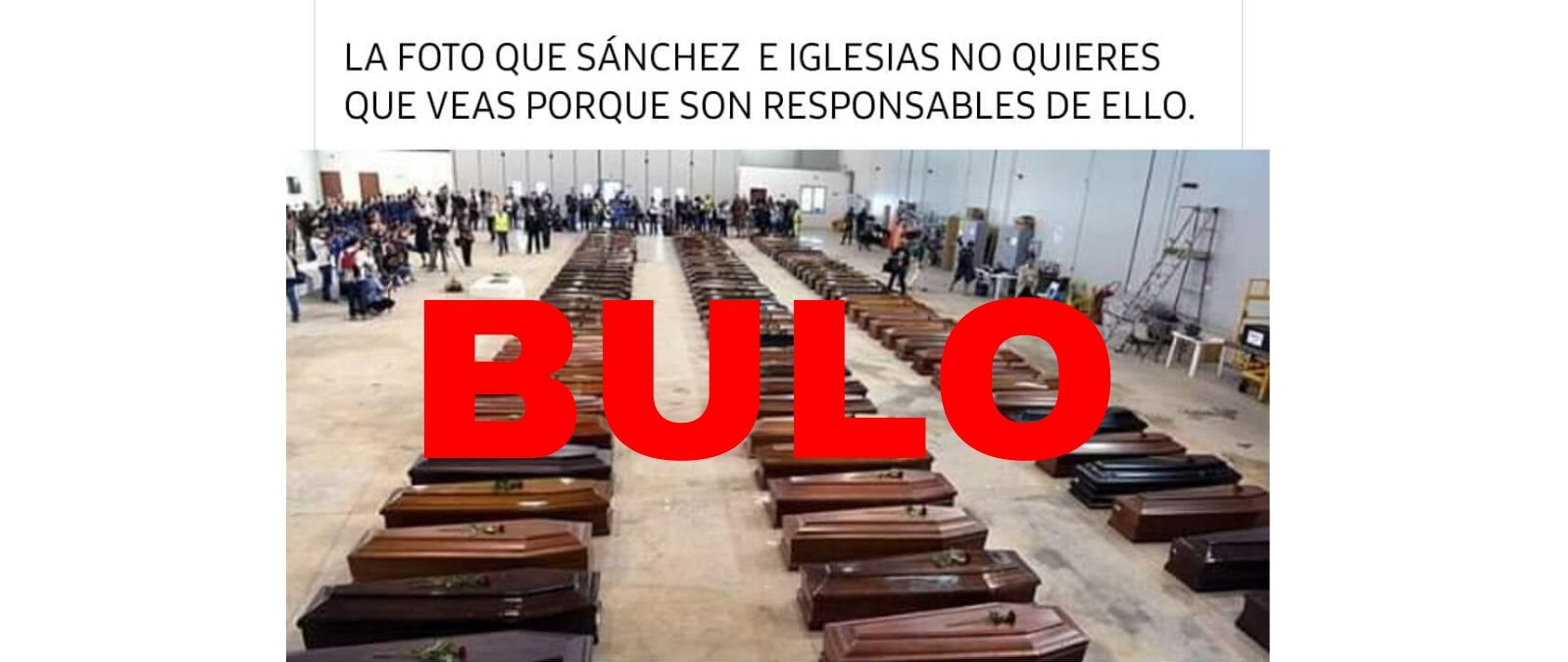 Está circulando en redes sociales una fotografía en la que se pueden ver muchos ataúdes en una sala y que va acompañada de un mensaje que dice "la foto que Sánchez e Iglesias no quieren que veas porque son responsables de ello", en el contexto de la pandemia actual de coronavirus. Pero es un bulo: no es en España ni está relacionada con el coronavirus.