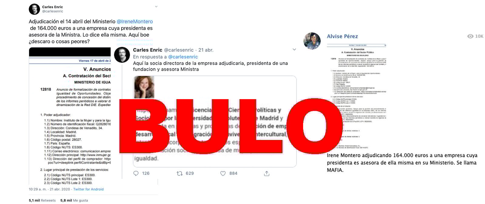 Los tuits virales incluyen una captura del anuncio de formalización de un contrato adjudicado para el "apoyo para la gestión del procedimiento de concesión del distintivo Igualdad en la Empresa (DIE), de los informes periódicos a valorar durante la vigencia del contrato y la dinamización de la Red DIE". Según dicho anuncio, la empresa adjudicataria del primer lote es Enred Consultoría por un valor de 164.000€. Así queda reflejado en el Boletín Oficial del Estado (BOE) y en la Plataforma de Contratación del Sector Público.