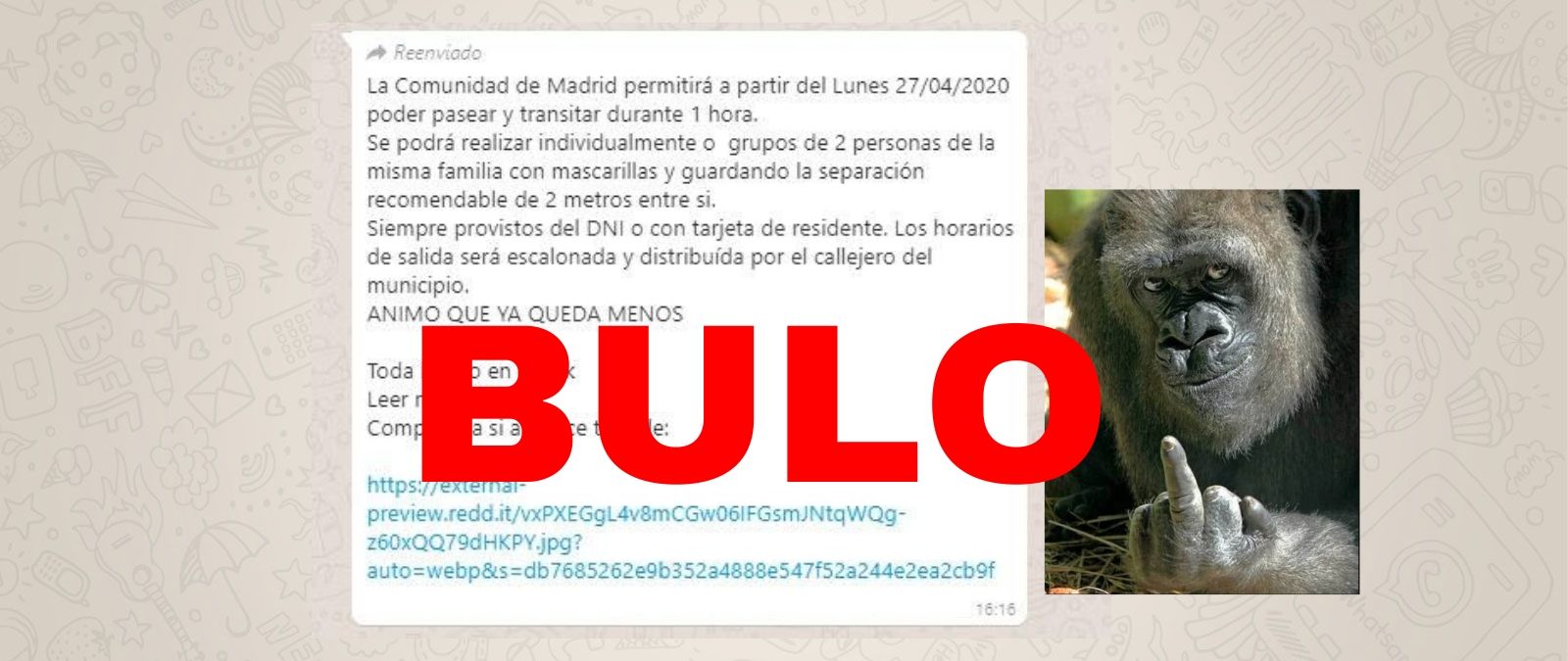Nos estáis preguntando por una cadena de WhatsApp que dice que la Comunidad de Madrid "permitirá a partir del lunes 27/04/2020 poder pasear y transitar durante una hora" de manera individual o por parejas, siempre que sean "dos personas de la misma familia con mascarillas y guardando la separación recomendable de 2 metros entre sí". Pero se trata de una broma.