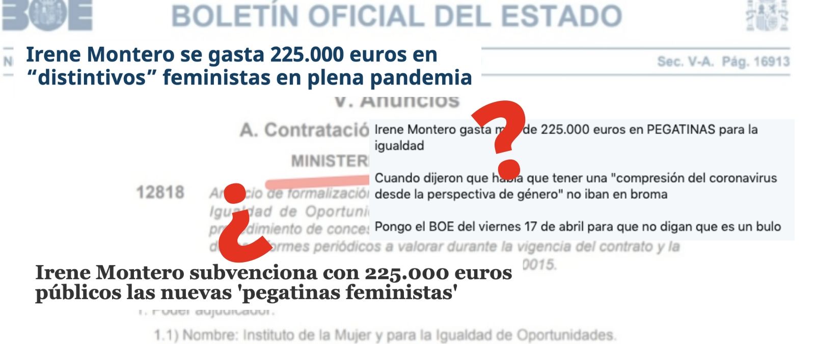 Los mensajes que se están difundiendo hacen referencia a la adjudicación del contrato para el “apoyo para la gestión del procedimiento de concesión del distintivo Igualdad en la Empresa (DIE), de los informes periódicos a valorar durante la vigencia del contrato y la dinamización de la Red DIE”. Mediterráneo Digital publicó un contenido titulado “Irene Montero subvenciona con 225.000 euros públicos las nuevas 'pegatinas feministas’”. También la web Moncloa.com publicó este 20 de abril un artículo titulado “Irene Montero se gasta 225.000 euros en “distintivos” feministas en plena pandemia”. Sin embargo, aunque la formalización de este contrato se hizo el 14 de abril y se publicó en el BOE el 17 de abril, la adjudicación de este contrato a las empresas Enred Consultoría (164.000€) y D'aleph Iniciativas y Organización S.A. (61.257,72€) no es actual, sino que se hizo el 17 de diciembre de 2019, como se puede ver en la Plataforma de Contratación Pública.