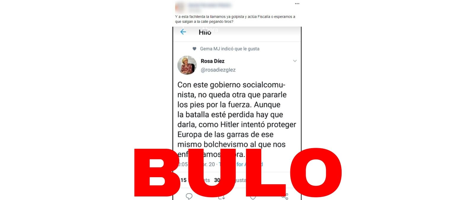 Se está difundiendo un tuit supuestamente publicado por la cofundadora de Unión Progreso y Democracia (UPyD), Rosa Díez, en el que dice que "con este gobierno socialcomunista, no queda otra que pararle los pies por la fuerza. Aunque la batalla esté perdida hay que darla, como Hitler intentó proteger Europa de las garras de ese mismo bolchevismo al que nos enfrentamos ahora". Pero es un bulo. Se trata de una cuenta "parodia" de Twitter que además ya ha sido bloqueada.
