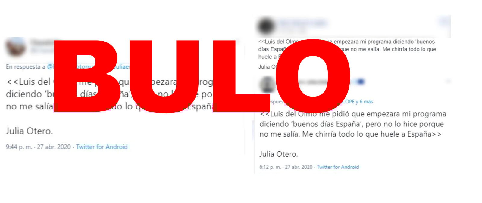 Circulan mensajes en redes (alguno ya borrado) asegurando que la periodista Julia Otero dijo en una conversación junto a Carlos Alsina en el programa de Onda Cero 'Más de uno' que "Luis del Olmo me pidió que empezara mi programa diciendo ‘buenos días, España’, pero no lo hice porque no me salía. Me chirría todo lo que huele a España". Es un bulo.