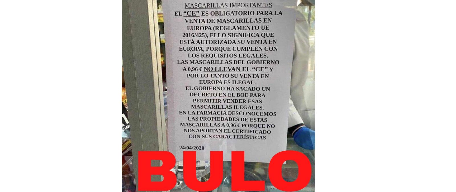 Nos habéis consultado por una fotografía en la que se ve un cartel en el que se anuncia que "las mascarillas del Gobierno a 0,96€", es decir, las quirúrgicas que son las que tienen el precio regulado, "no llevan el 'CE'" y, por lo tanto, "su venta en Europa es ilegal". "El Gobierno ha sacado un decreto en el BOE para permitir vender esas mascarillas ilegales", reza el cartel. Es un bulo.